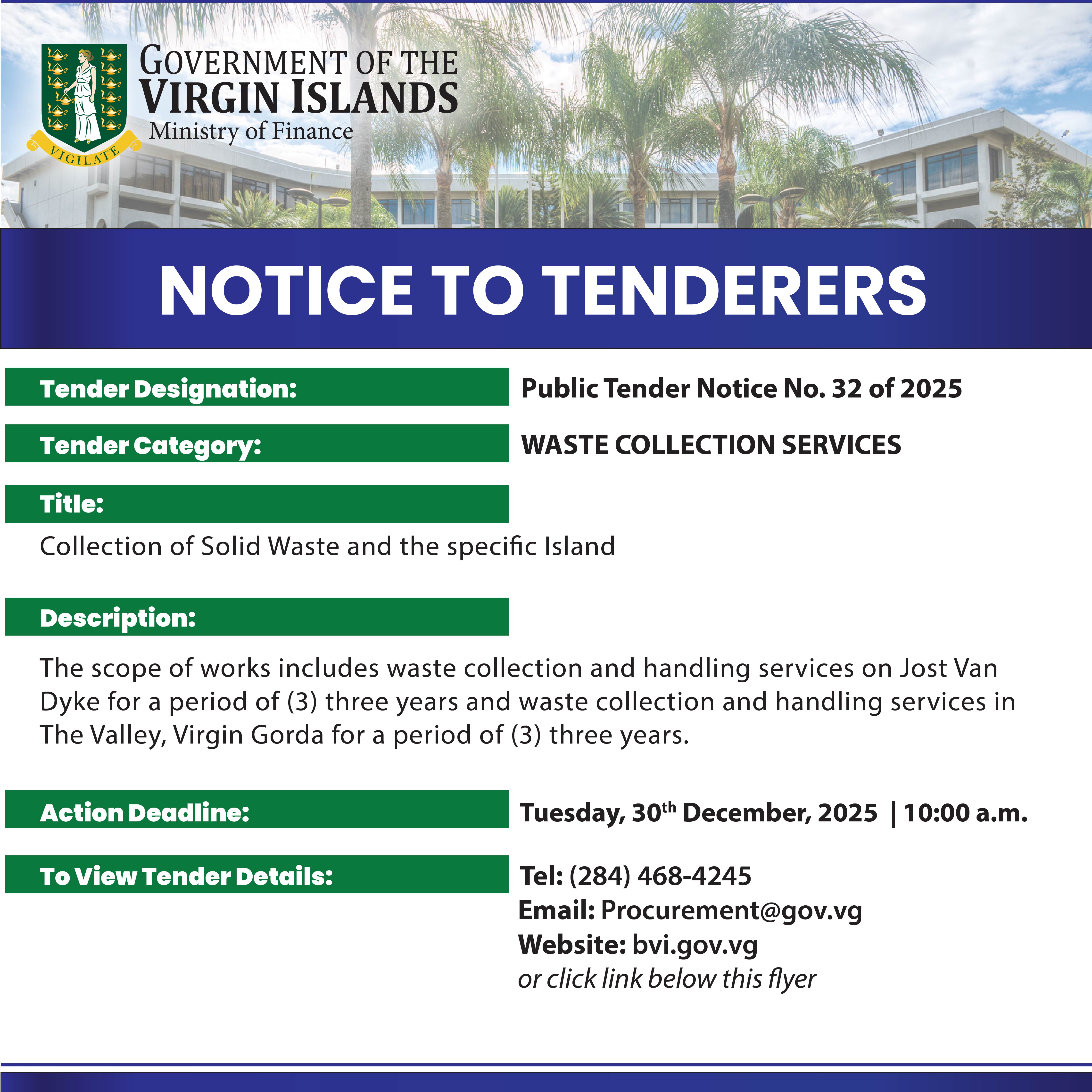 The Government of the Virgin Islands (British) is inviting tenders for the collection of solid waste on Jost Van Dyke and in The Valley, Virgin Gorda. The successful tenderers will be contracted to provide waste collection and handling services for a period of three (3) years on each island.