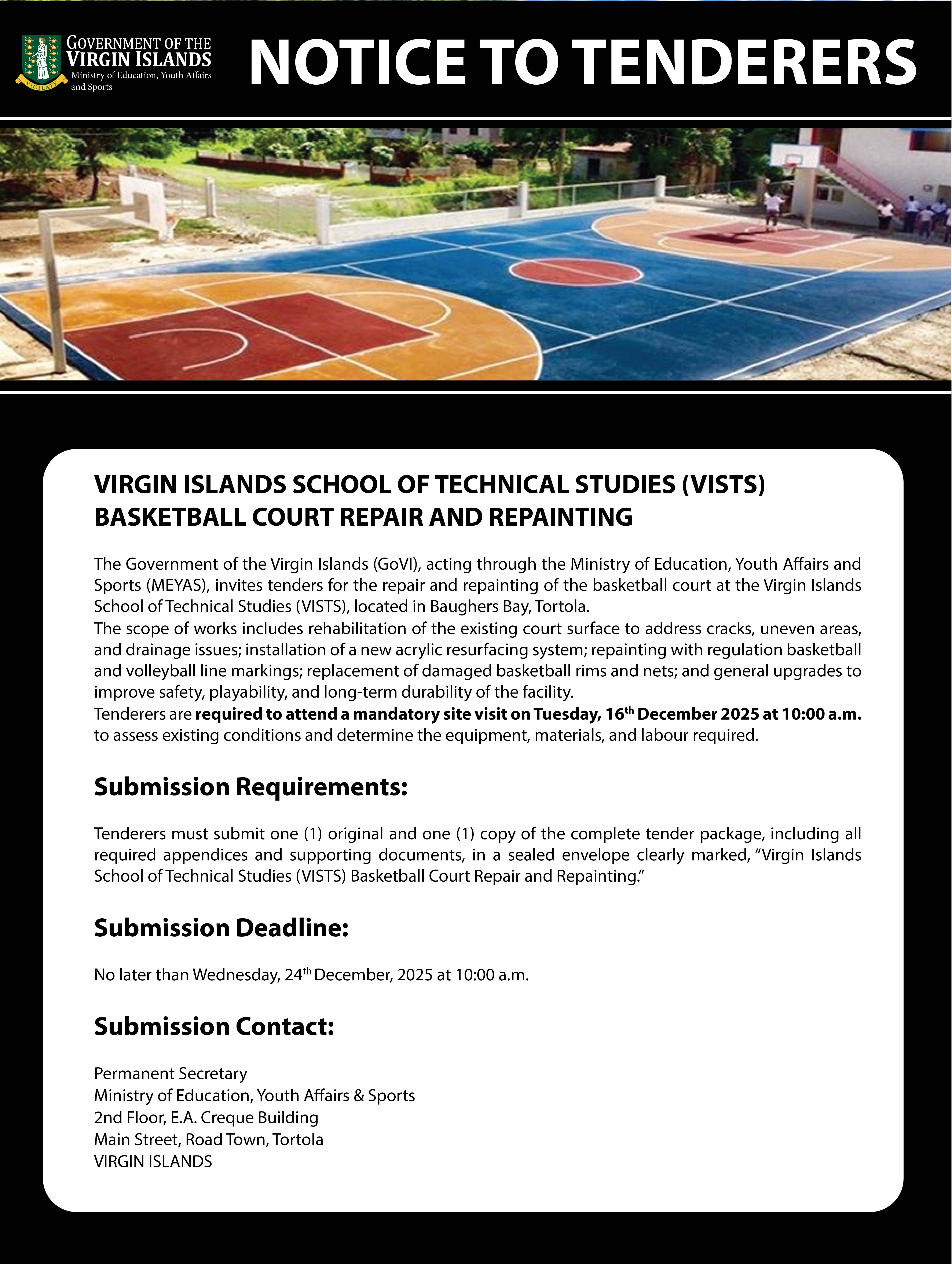 The Government of the Virgin Islands, through the Ministry of Education, Youth Affairs and Sports, is inviting tenders for the repair and repainting of the basketball court at the Virgin Islands School of Technical Studies (VISTS), located in Baughers Bay, Tortola.