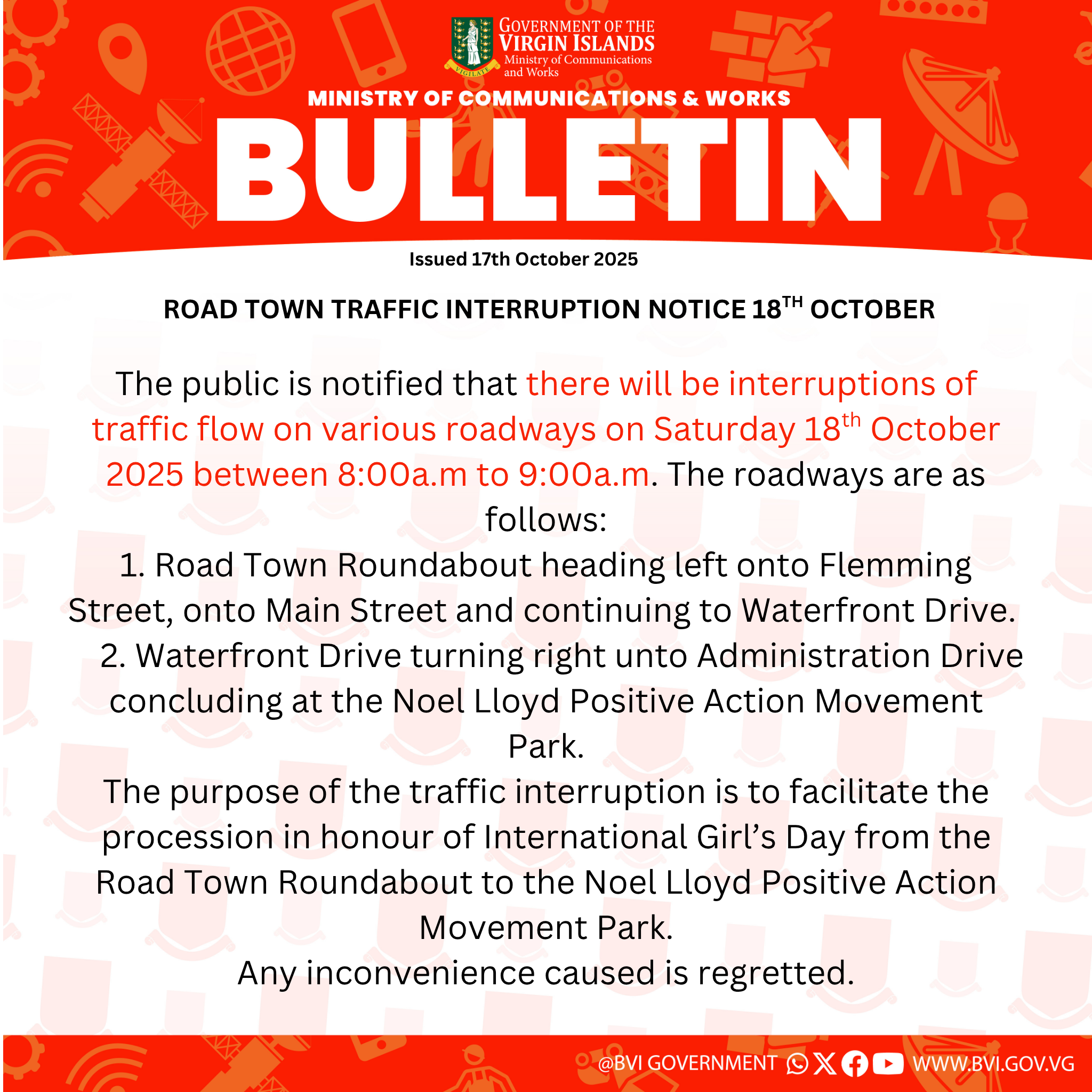 The purpose of the traffic interruption is to facilitate the procession in honour of International Girl’s Day from the Road Town Roundabout to the Noel Lloyd Positive Action Movement Park. Any inconvenience caused is regretted.
