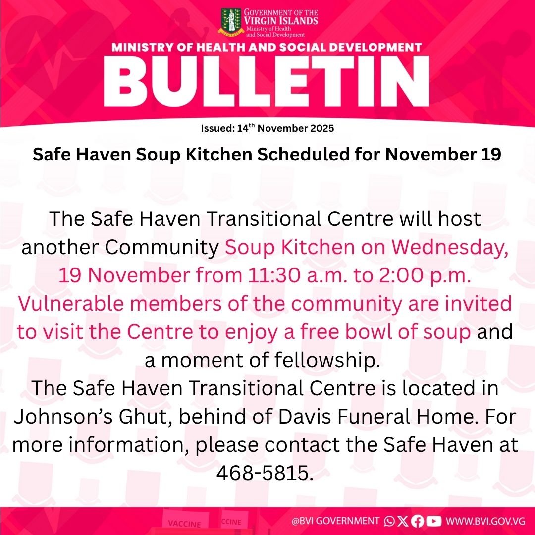 The Safe Haven Transitional Centre will host another Community Soup Kitchen on Wednesday, 19 November from 11:30 a.m. to 2:00 p.m. Vulnerable members of the community are invited to visit the Centre to enjoy a free bowl of soup and a moment of fellowship.