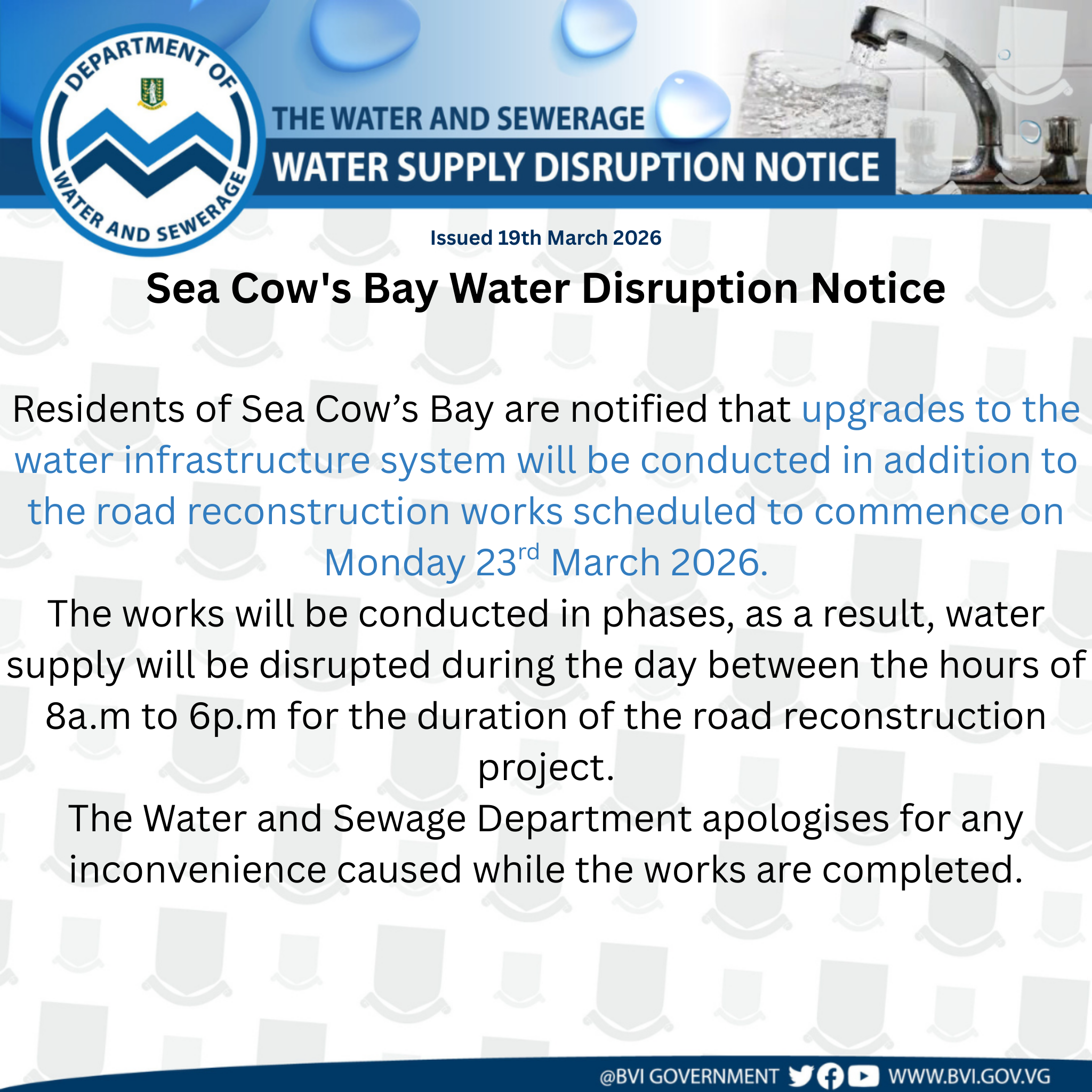 Residents of Sea Cow’s Bay are notified that upgrades to the water infrastructure system will be conducted in addition to the road reconstruction works scheduled to commence on Monday 23rd March 2026.