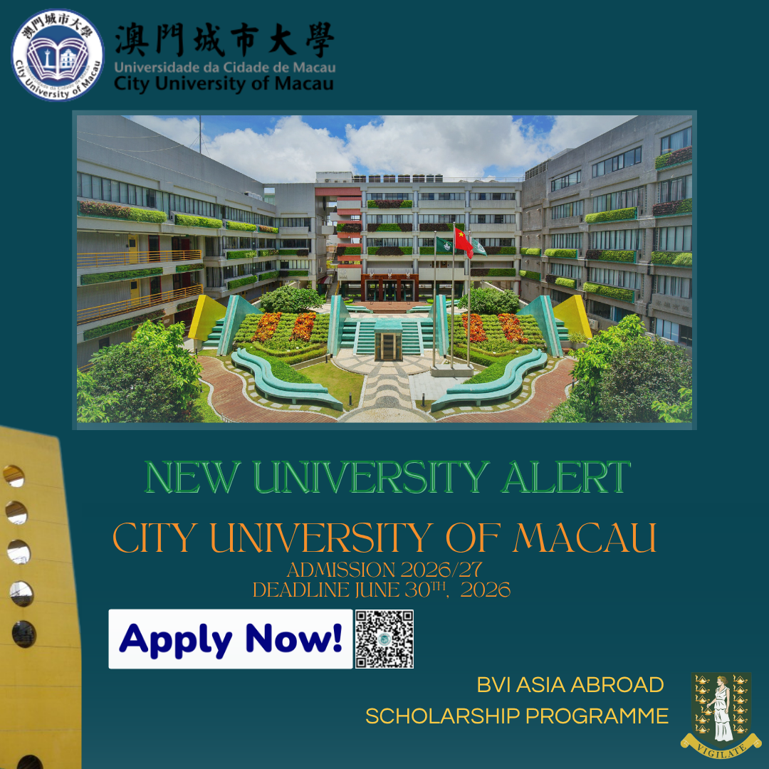 Applications for the 2026/27 academic year are now open, with a deadline of 30th June 2026. Eligible students may also apply for the BVI Asia Abroad Scholarship Programme.