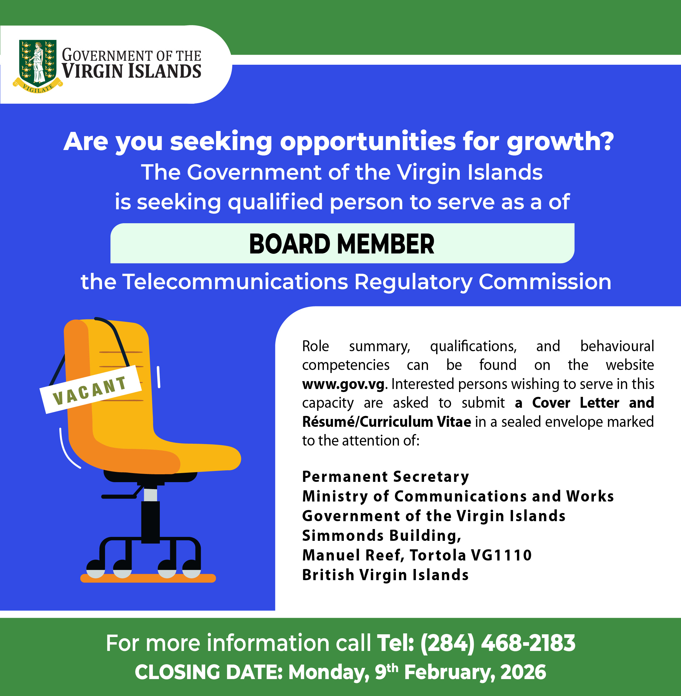 The Government of the Virgin Islands is seeking qualified persons to fill the following positions: Board Member/Commissioner.