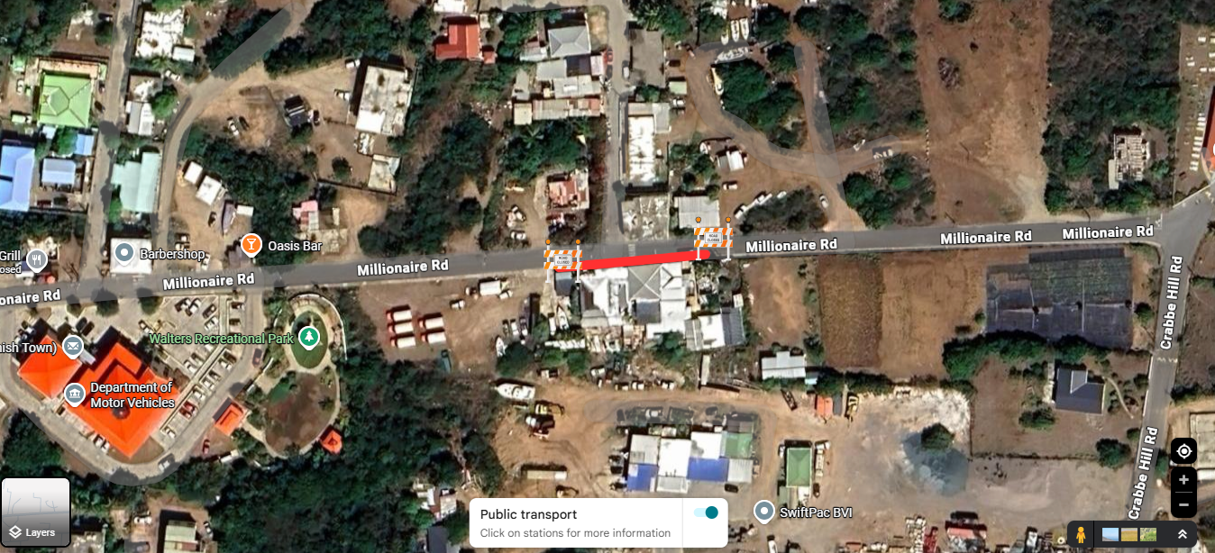 The public is advised that a portion of Millionaire Road in the vicinity of Anything Goes Bar and Restaurant will be temporarily and partially closed on Thursday 25th December from 12 noon to 8:00p:m.