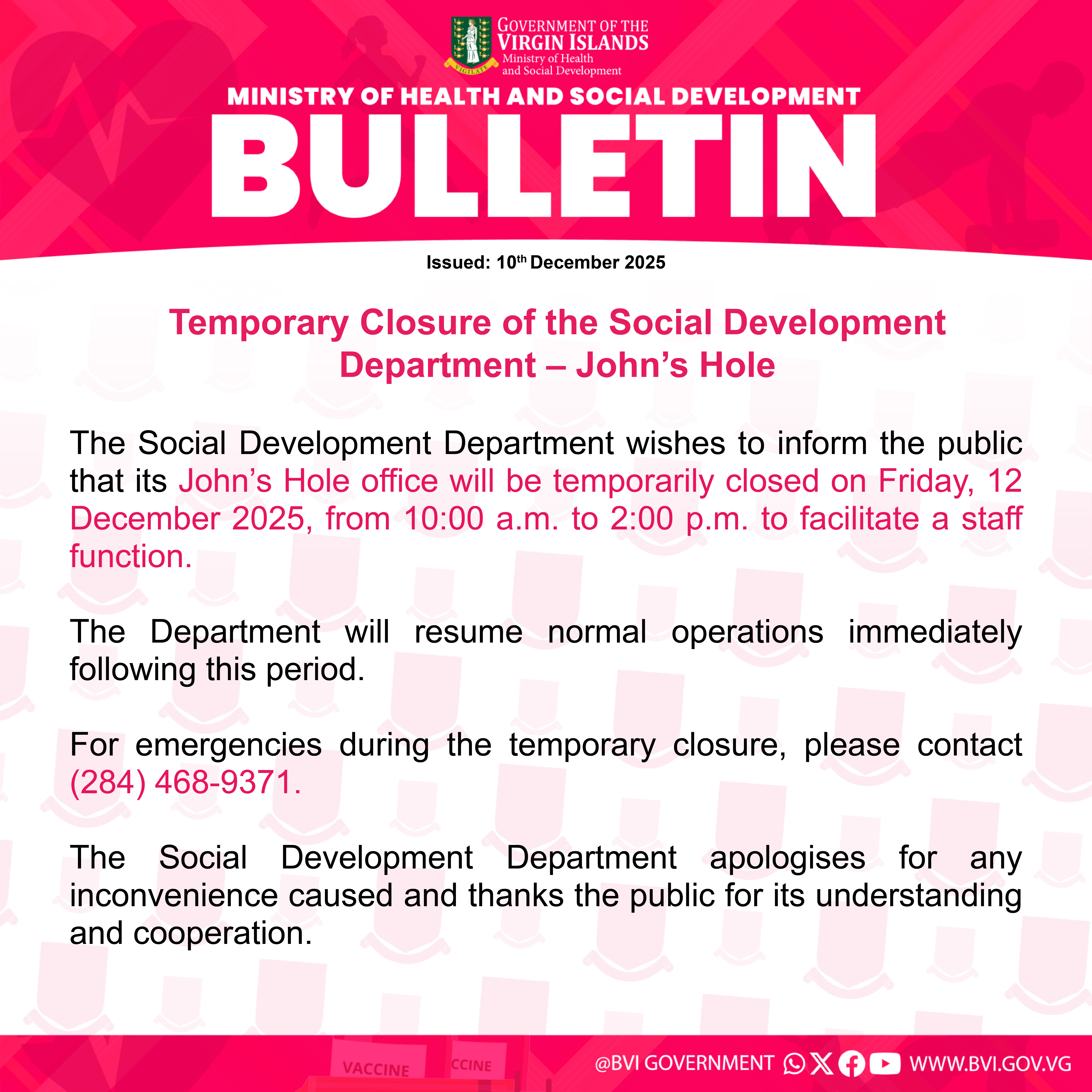 The Social Development Department wishes to inform the public that its John’s Hole office will be temporarily closed on Friday, 12 December 2025, from 10:00 a.m. to 2:00 p.m. to facilitate a staff function.