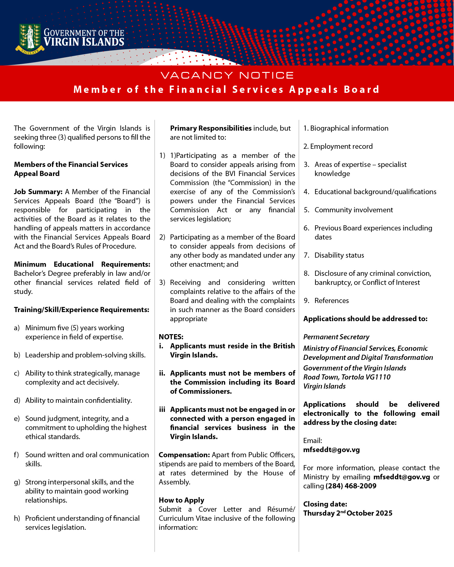 - Participating as a member of the Board to consider appeals arising from decisions of the BVI Financial Services Commission (the “Commission) in the exercise of any of the Commission’s powers under the Financial Services Commission Act or any financial services legislation;