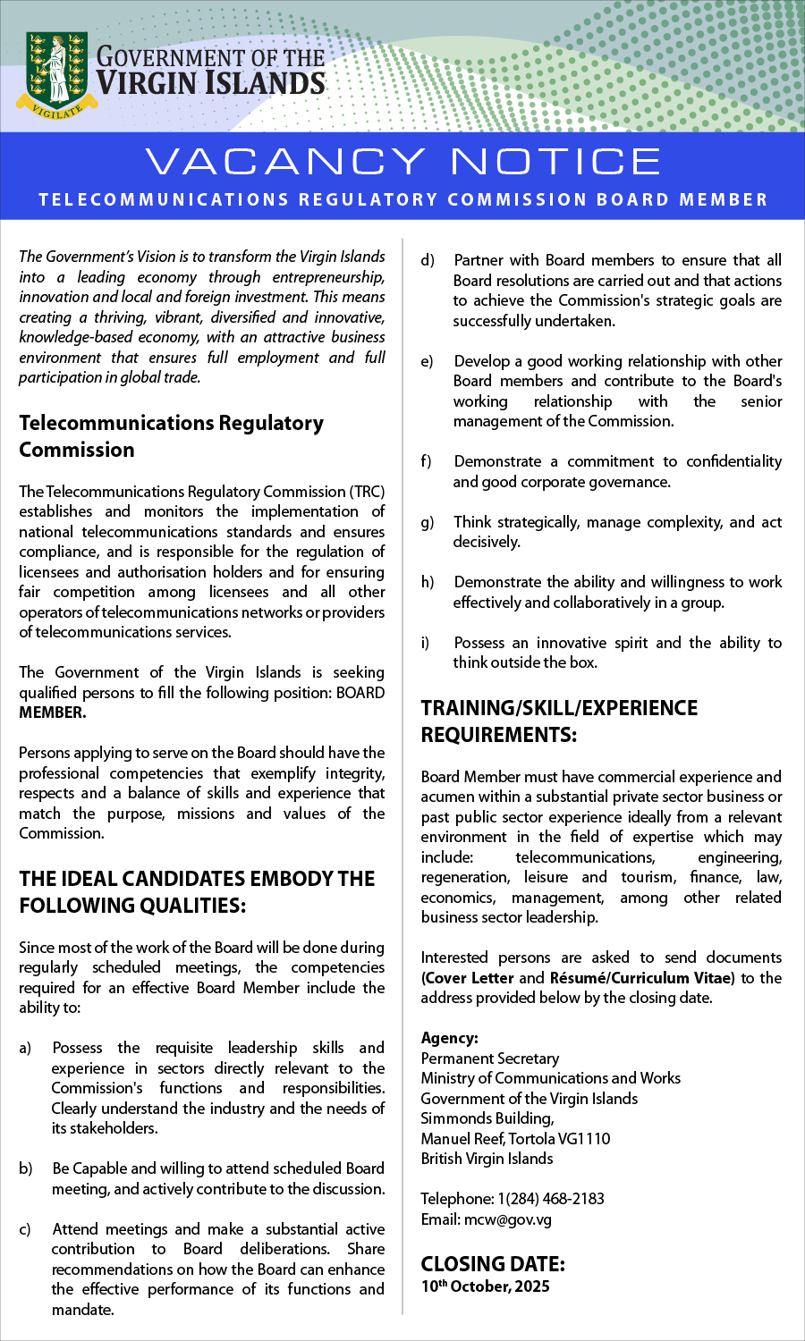 CLOSING DATE: 10th October, 2025