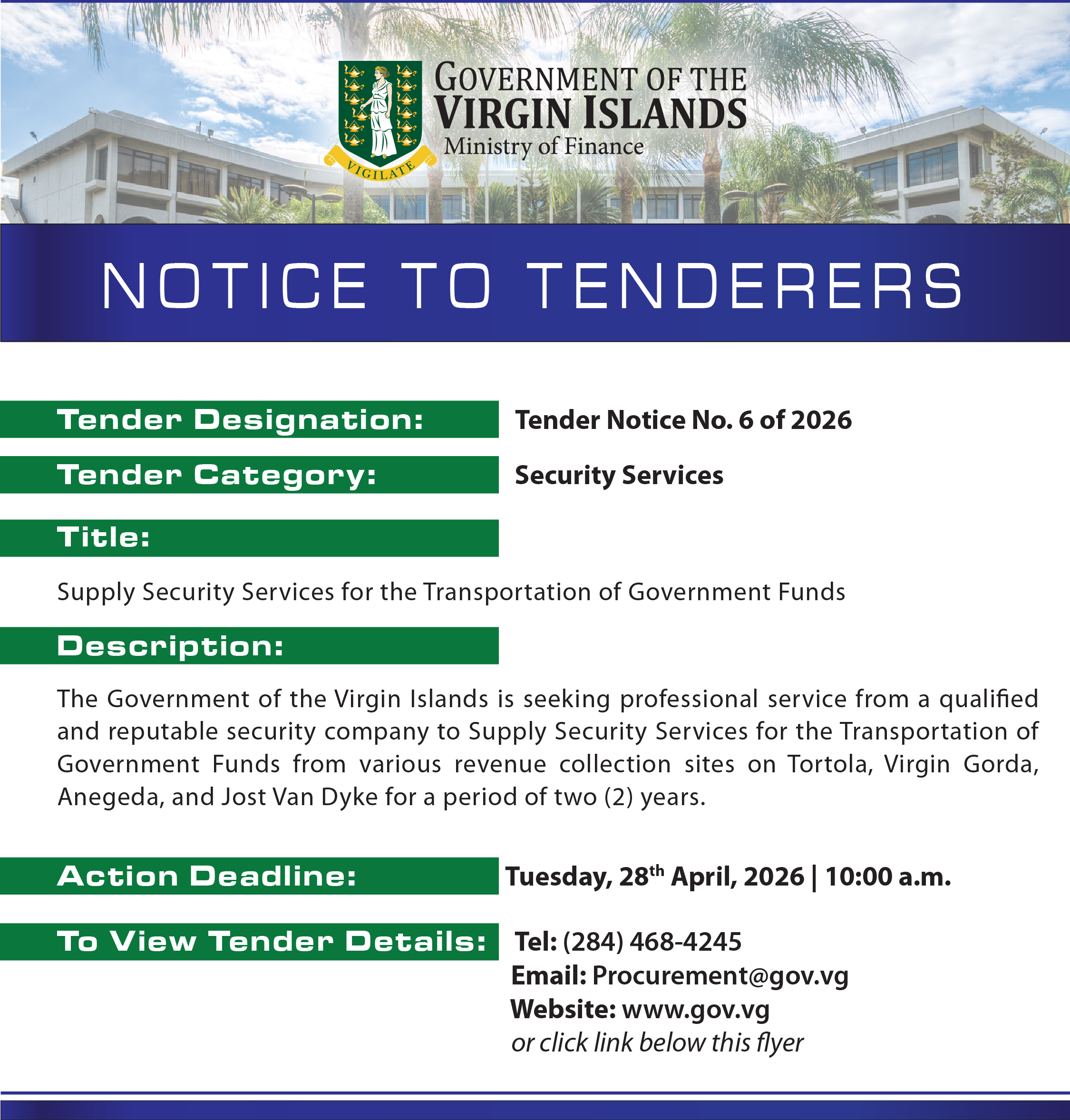 The Government of the Virgin Islands is seeking professional service from a qualified and reputable security company to Supply Security Services for the Transportation of Government Funds from various revenue collection sites on Tortola, Virgin Gorda, Anegeda, and Jost Van Dyke for a period of two (2) years.
