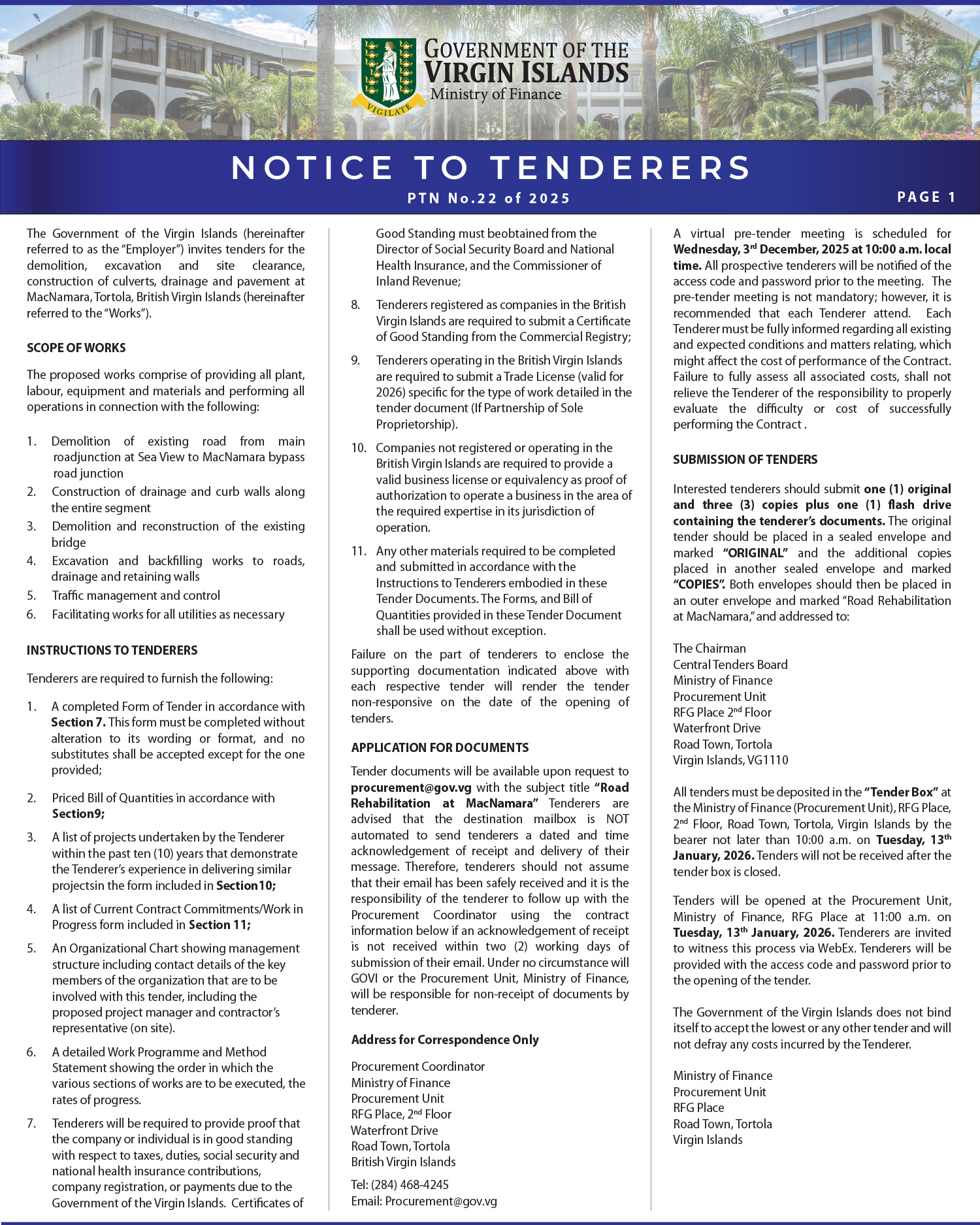 Tender documents are available upon request via email to procurement@gov.vg with the subject line “Road Rehabilitation at MacNamara.” A virtual pre-tender meeting will be held on Wednesday, 3rd December 2025 at 10:00 a.m. local time. While not mandatory, attendance is encouraged to ensure full understanding of the project scope and conditions.
