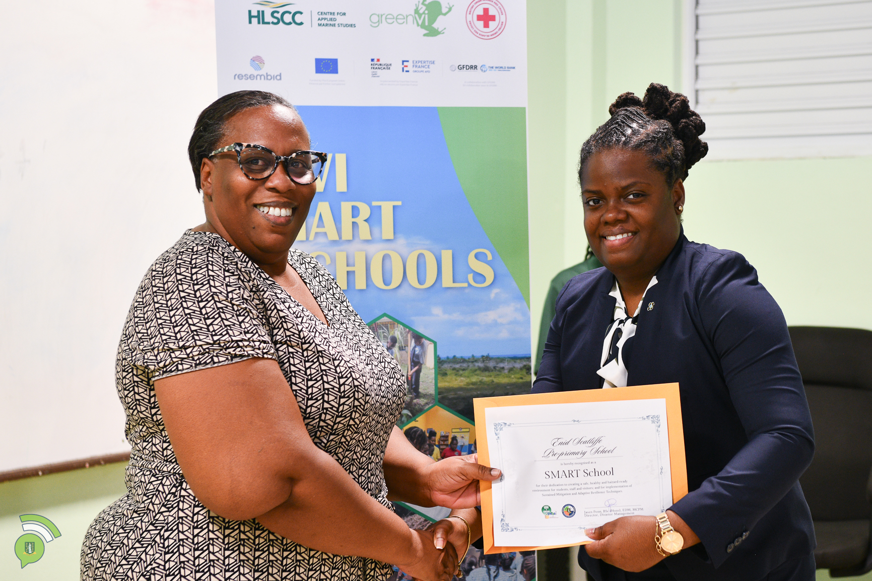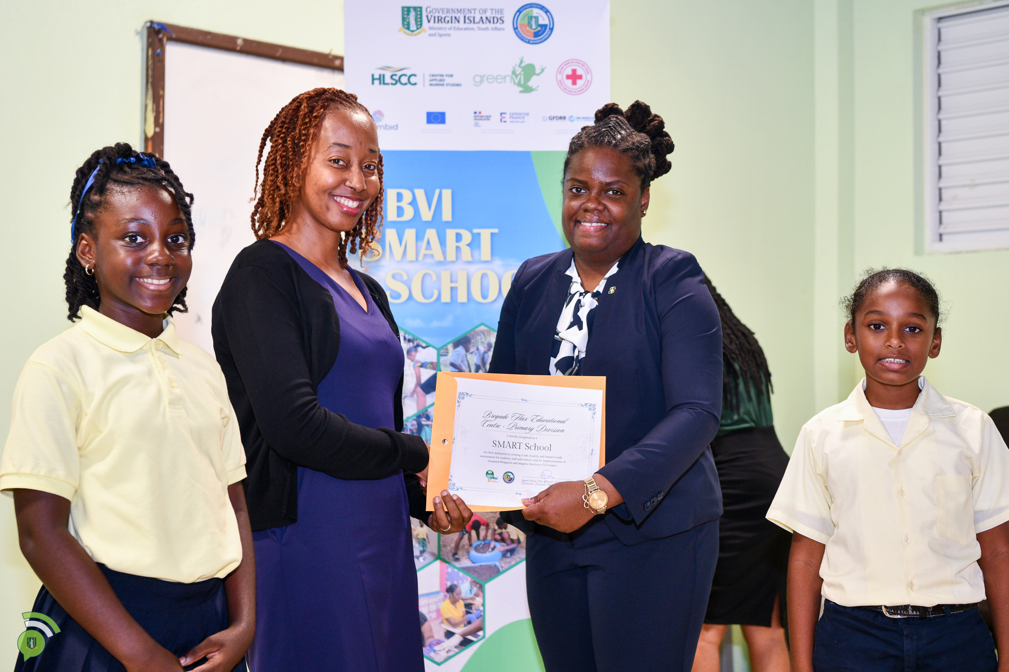 Mr. Penn, while addressing a recognition ceremony for principals and students said, “This expansion of SMART Schools has been a collaborative effort by the DDM, Ministry of Education, HLSCC Centre for Applied Marine Studies, the BVI Red Cross, and Green VI, and it was supported by a €1.3m grant from the European Union’s Resilience, Sustainable Energy and Marine Biodiversity (RESEMBID) programme.”