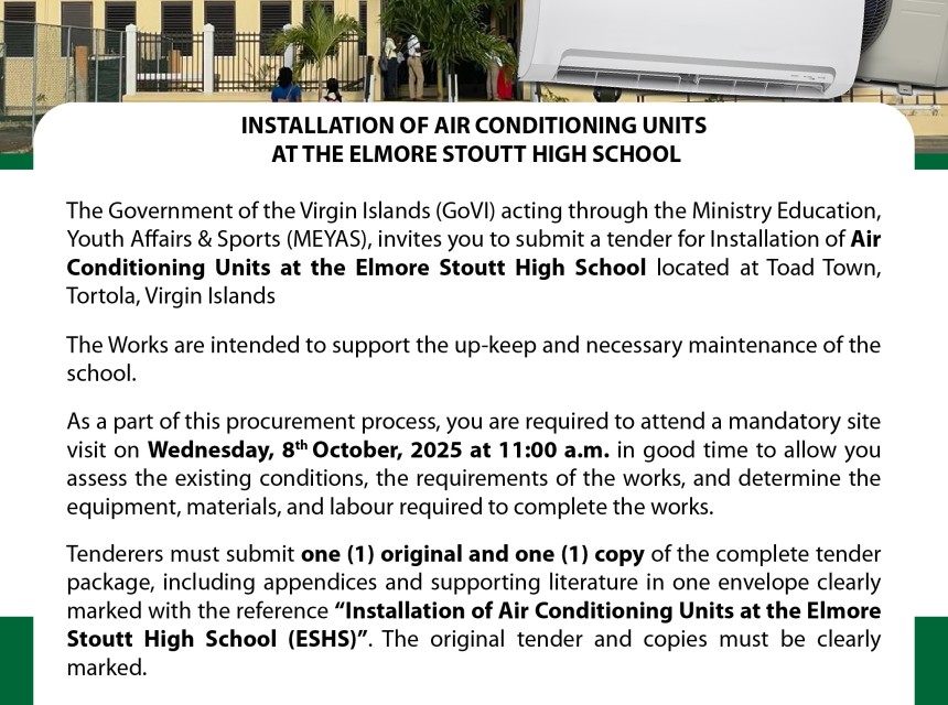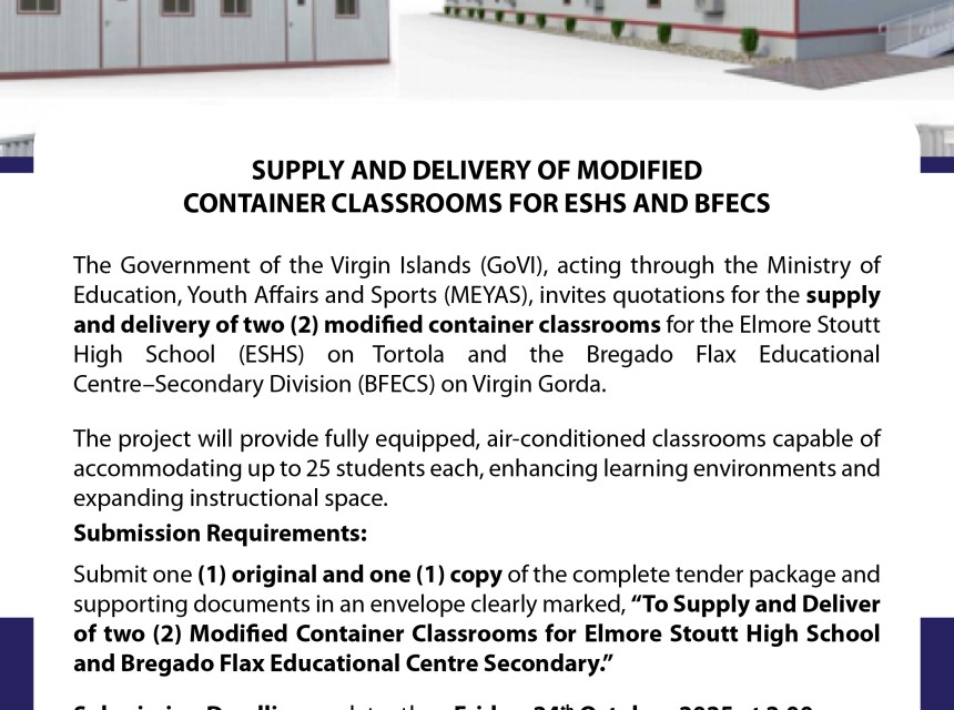 The Government of the Virgin Islands, through the Ministry of Education, Youth Affairs and Sports, is inviting tenders for the connection of a 5,000-gallon water