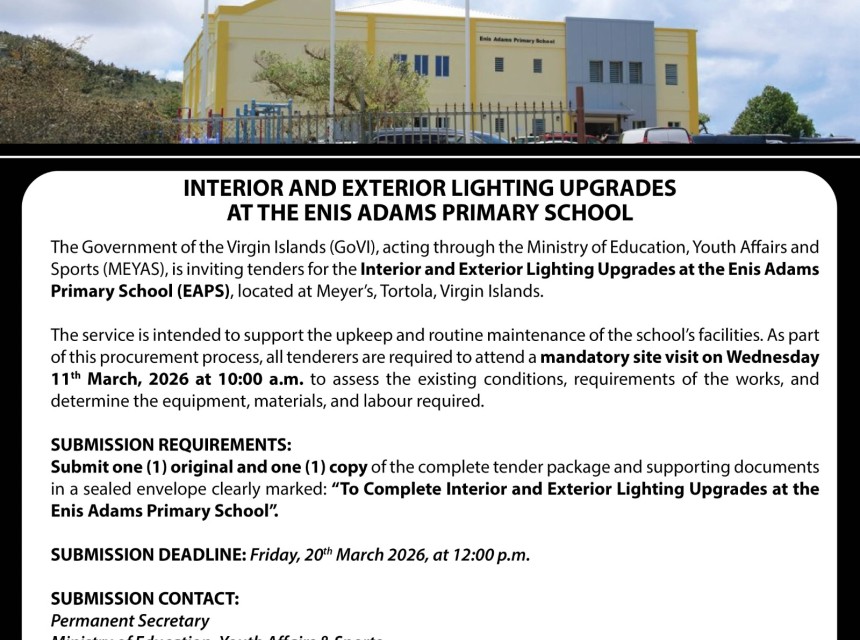 The Government of the Virgin Islands, through the Ministry of Education, Youth Affairs and Sports, is inviting tenders for the Supply and Delivery of a